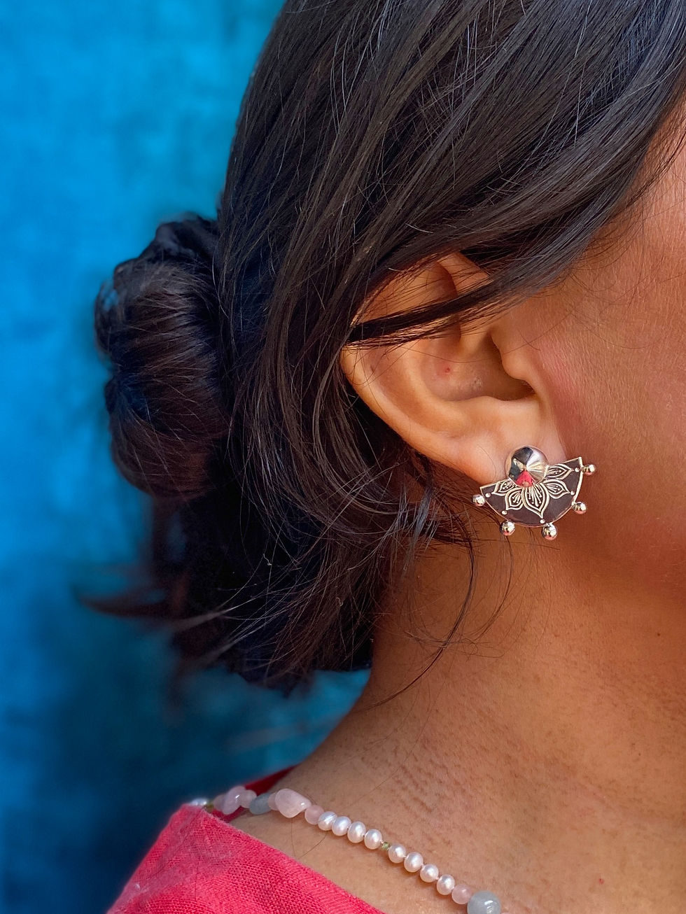Handmade in 925 sterling silver, the piece combines traditional forging techniques with the lost wax casting method for a truly unique design. The necklace features hand-engraved floral vines that elegantly wrap around, with seven symbolic flowers set with faceted fire opals and rubelites. Each terminal is adorned with a pink tourmaline cabochon.